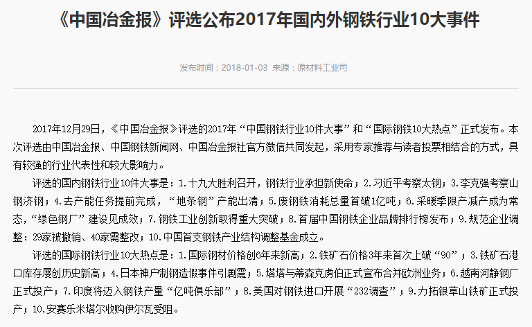2018年1月3日,工業和信(xìn)息化部在官網上刊出《<中國冶金報>評選公布2017年國內外鋼鐵行業10大事件》一文,對《中國冶(yě)金報》評選的2017年“中國鋼(gāng)鐵行業10件大事”和“國際鋼鐵10大熱點”進行了介紹。